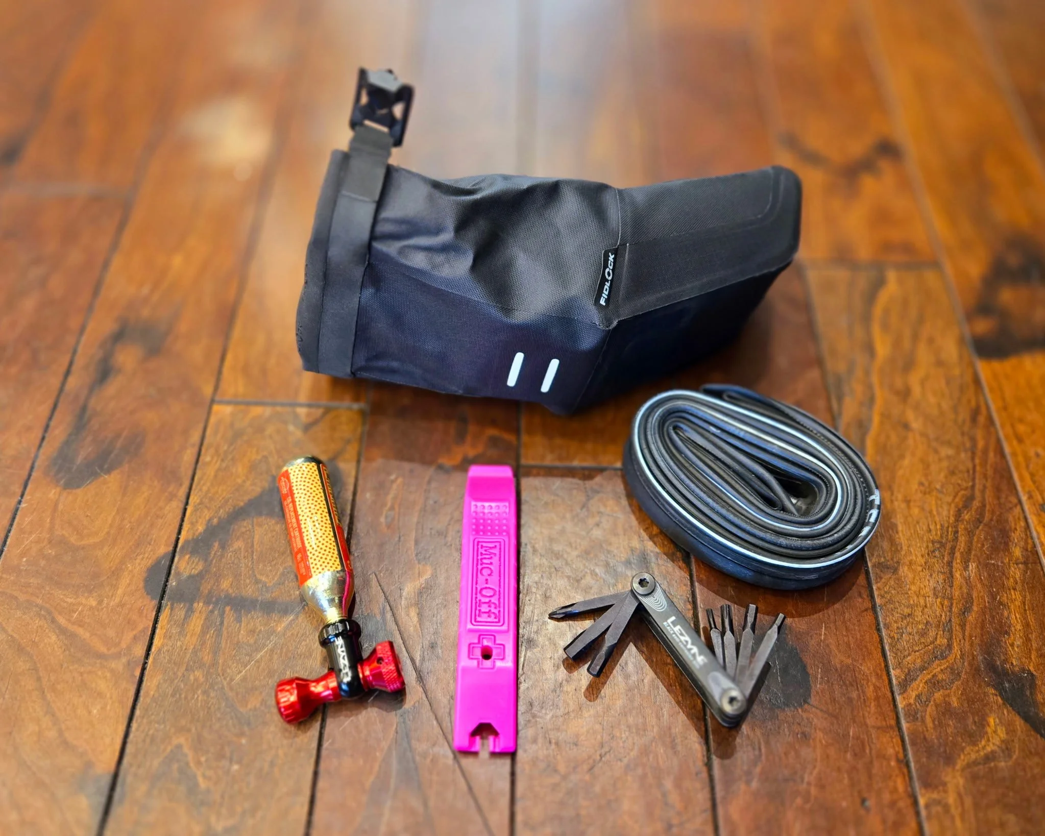 This setup is ideal for road, gravel, and mountain bikes. With modern bike and wheel systems, most wheels require a hex wrench for removal and installation, making a small multi-tool an essential part of any saddle bag kit.