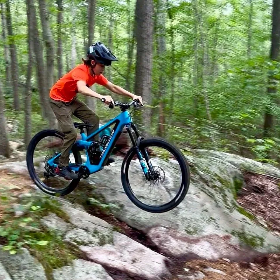 15 year old Noah Grinker enjoying a Transition Relay eMTB on the trails